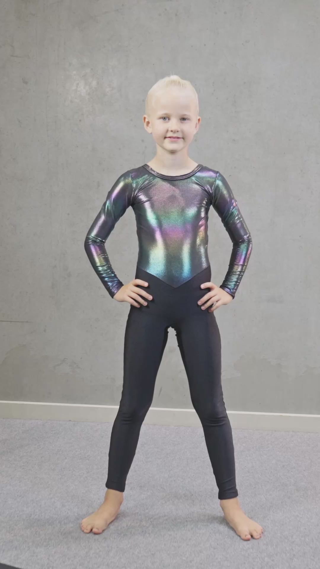 Harjoittelu kohtaa kilpailun. Monet lapset haaveilevat “oikeasta voimistelupuvusta” viikoittaiseen harjoitteluun. Tässä se on. Voimistelupuku, jossa on runsaasti kimalletta. Pitkähihainen kokopuku – täydellinen toisinaan viileisiin saleihin.