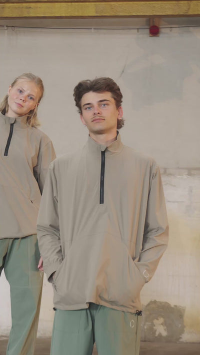 Tekninen anorakki valkoisilla ompeleilla. Sopii täydellisesti Tech 02 -housujen kanssa, joita on saatavana myös ruskeana valkoisilla tikkauksilla. Käytä anorakkia sisällä ja ulkona - harjoitteluun ja arkeen. Tech-materiaalissa on laadukkaita ominaisuuksia, kuten hieman vettä hylkivä pinta, materiaali on nopeasti kuivuva ja siinä on joustavuutta, joten käyttömukavuus on korkea. Mille on 171 cm pitkä ja käyttää kokoa S Anton on 185 cm pitkä ja käyttää kokoa L.